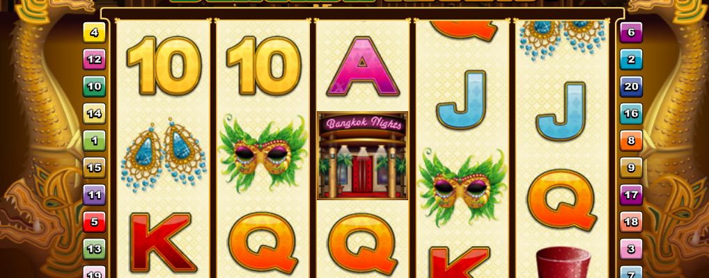 Play in Bangkok Nights can be any number of lines from 1 to 20, the line takes from 1 cent to $ 5. There are 5 reels involved in the game. There is no progressive jackpot and the payback percentage is 95.12. It is possible to speed up the gameplay by starting the automatic spinning of the reels. Profits are awarded for combinations of several of the same symbols, with the chains going from left to right. The last rule also applies to special symbols (the Wild and Scatter) and their combinations. For 3 to 5 card symbols or show tickets you will get from 5 to 150 current bets, for 2 to 5 pictures with gloves, cylinders and earrings – from 3 to 500, for 2 to 5 carnival masks – from 6 to 1250 multipliers.