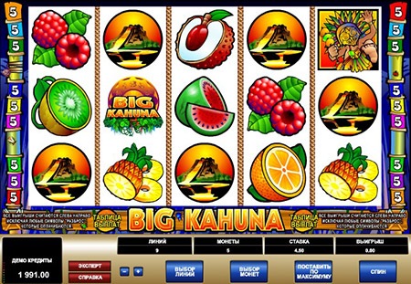 Like most other slot games produced by Microgaming, Big Kahuna has a very flexible betting system. Using the buttons at the bottom of the screen you can change the number of active lines, the number of coins per line and the coin value. The first can be from 1 to 9, the second from 1 to 5, and the third from 2.25 to 22.50 On the reels of the game you will find a variety of interesting symbols. The high paying icons are the tribal leader and the reptile. They pay out winnings even on a roll of just 2 of these symbols in a line. For them, you can get from 5 to 500 coins. Low paying icons include a variety of fruits: oranges, kiwi, watermelons, pineapples and berries. Payouts for these symbols range from 10 to 250 coins.