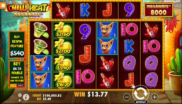The expensive icons in Chilli Heat Megaways are man, dog, chilli and lemon. All of them have a different value. So, combinations of 3 of these symbols can bring you payouts of up to 30 coins, and combinations of 6 can bring you payouts of up to 1,000 coins. Cheap symbols are represented by the classics A, K, Q, J and 10. Lines consisting of 3 of these will win you up to 10 coins and those consisting of 6 will win you up to 150 coins. Before you start spinning the reels directly, you must first place your bet. This is done using the buttons at the bottom of the screen. Each spin can be wagered from 0.20 to 100 coins, allowing the gamblemaker to play with any account balance.