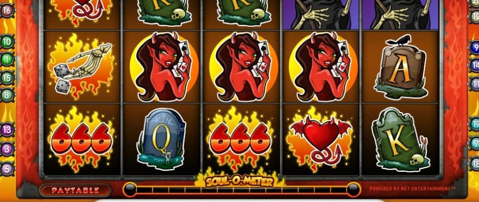 • Sin Spins – Another bonus round . It is activated when all the cells in the Soul-O-Meter scale are filled with souls. Instead of the usual symbols, souls of different colours will appear on the reels, representing the 7 main sins: pride, greed, envy, anger, lust, gluttony and sloth. The user gets 10 free spins in this round, and must collect combinations on 20 lines, as in the main round. The symbols in Sin Spins bring much more winnings than in normal mode.