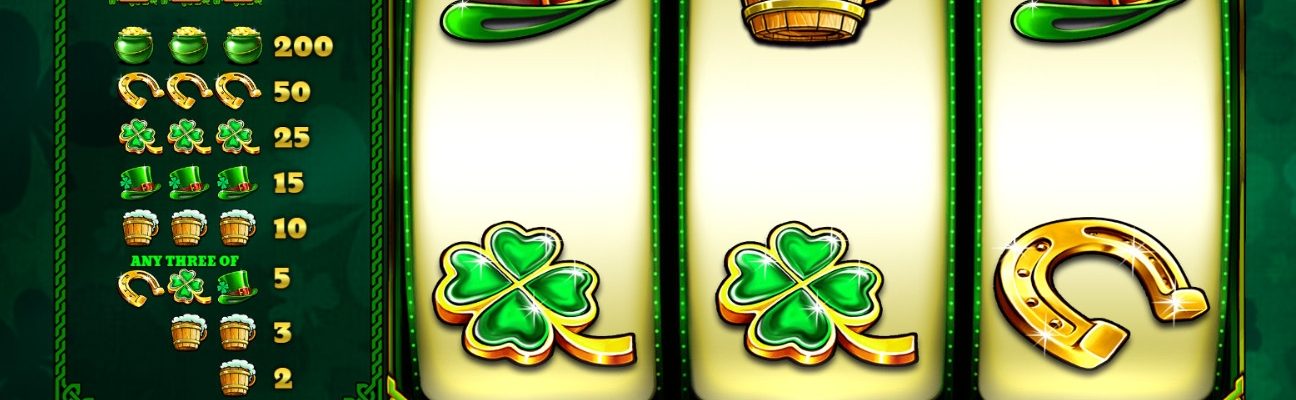 A wooden mug of foaming beer, a green leprechaun cylinder, a four-leaf clover, a golden horseshoe, a pot of coins and sevens appear on the slot screen.