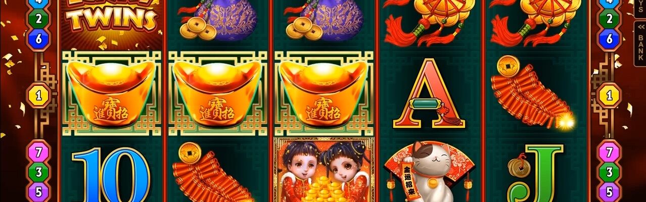 Various items associated with Chinese culture, the game logo, and card denominations from ten to Ace appear on the screen of the Lucky Twins slot machine.