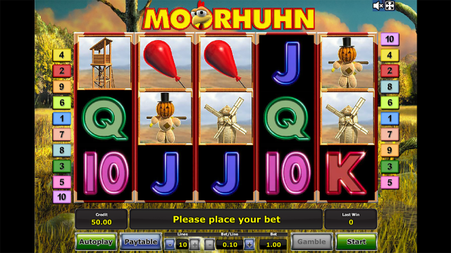 Placing bets in the free online Moorhuhn slot machine is simple and is done with just a few clicks. First, the player needs to set the number of lines by pressing “+” for increasing and “-“ for decreasing the value (from 1 to 10). After that, set the bet per line. It goes from 0.01 to 50 coins. The max bet is the number of lines multiplied by the bet per line and the total amount can go up to 500 coins. The machine contains the autoplay option. When you chose this option reels are going to spin constantly until you hit the “stop” button or you run out of coins. You can’t change the bet amount during the autoplay. All wins are paid from left to right, except the scatter prizes.