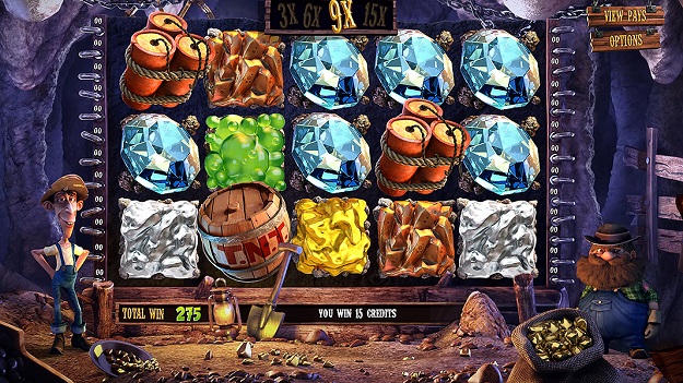 Betsoft never disappoints when it comes to the games they release. In this energetic game, you’ll be blowing up various symbols in a mine in order to get to the hidden treasure there. Jeb and Cletus will encounter various creatures in their path, who will hinder them in every way possible, while a wooden device will spin the reels. Players should pay attention to the Wild symbol, which is represented by a bundle of dynamite and can substitute for all other symbols in the game, including the bonus symbol. The bonus symbol only appears on reels one through three. Once you’ve collected at least 3 of the same symbols you can keep blowing up the symbols as long as they form winning combinations. This slot is very attractive in appearance as you watch the symbols slowly drop onto the reels from the top of the screen. The main characters of the game, Jeb and Cletus, stand beside you and watch as you help them find more and more minerals by blowing up the various icons.