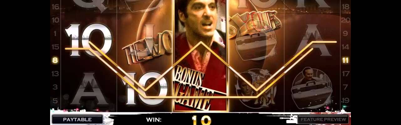Scarface slot machine coin denominations range from 0.01 to 0.5. Betting levels, or the number of coins per line, are a maximum of 10, and you can use these to set betting limits that will suit your bankroll. The game has 20 fixed paylines, which means you can’t choose the number of paylines you bet on. Instead, your bets are automatically applied to all 20 paylines. The maximum bet will cost you 100.00, while the minimum bet is only 0.20. This wide range of betting limits makes Scarface slot machine suitable for players of all limits, as long as you don’t mind a little bloodshed happening on the reels. Payouts are made according to the payout table, and the game’s maximum jackpot is $10,000.