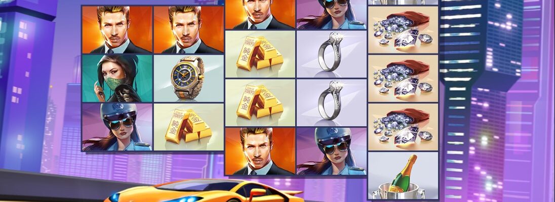 The reels of the slot machine feature the guy and girl we know from The Wild Chase. A mysterious masked robber and a Japanese woman in a traffic police uniform also appear. There’s also a diamond, gold bars, a watch, a ring and a bottle of champagne in a bucket. The icons can be stacked.